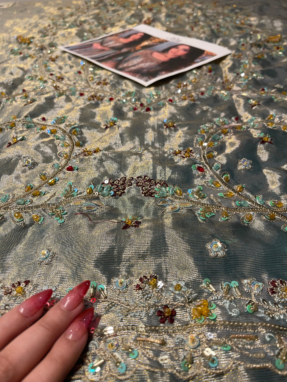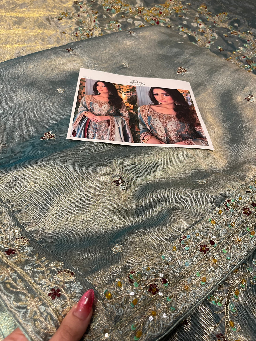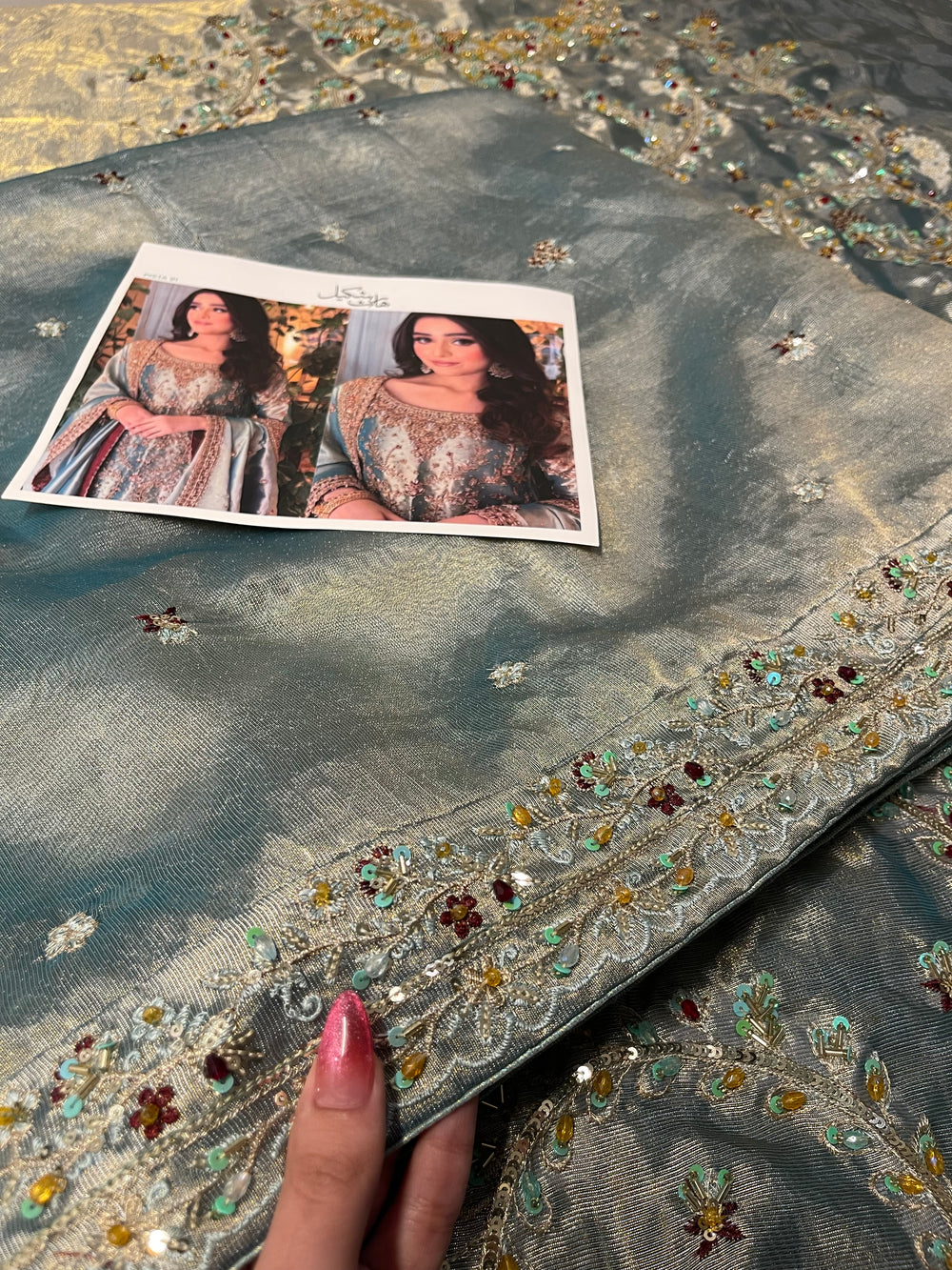 This graceful ensemble is rendered in a soothing aqua-teal palette, elevated with intricate embellishments throughout. The design showcases delicate hand-worked motifs paired with an opulently embellished/embroidered border, creating a look of refined elegance. A flowing dupatta with ornate detailing completes the ensemble, making it a perfect choice for festive occasions and formal celebrations.