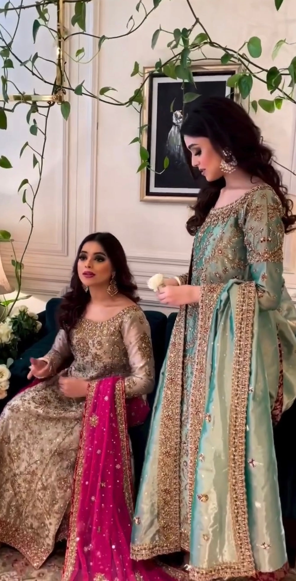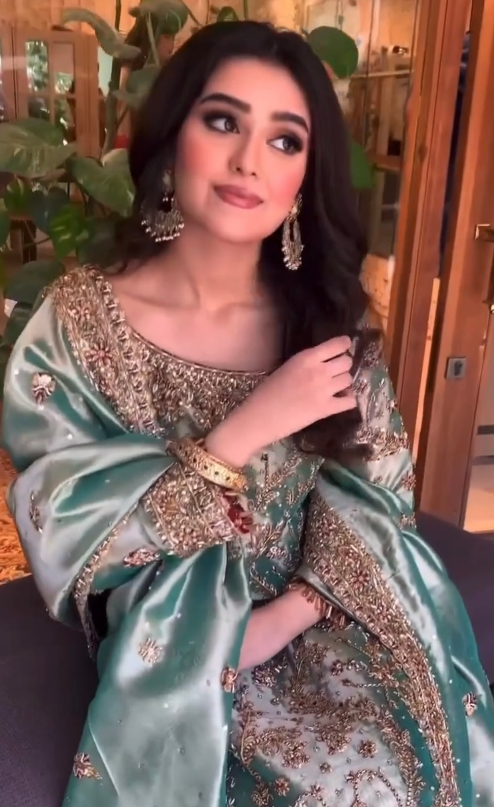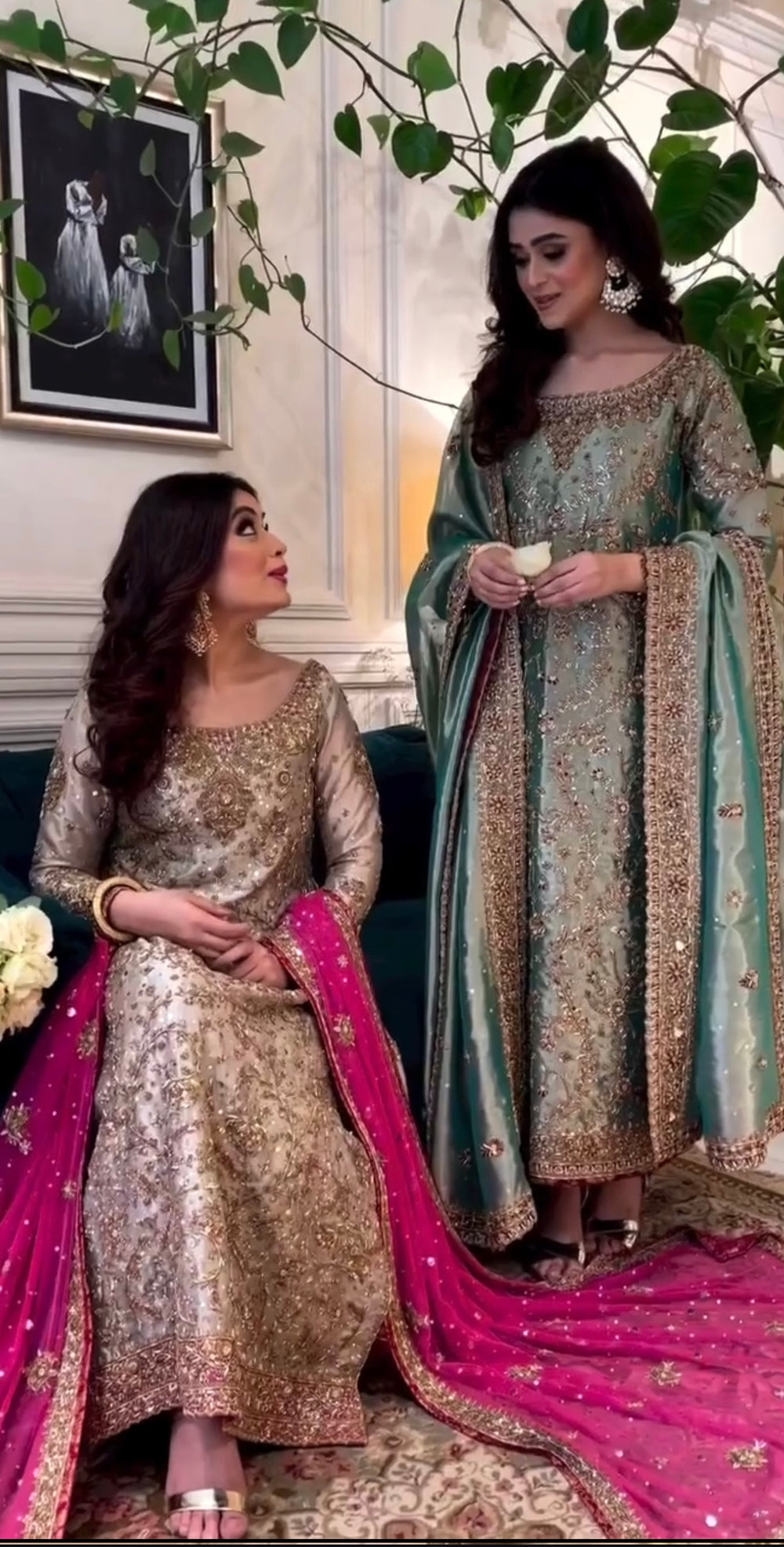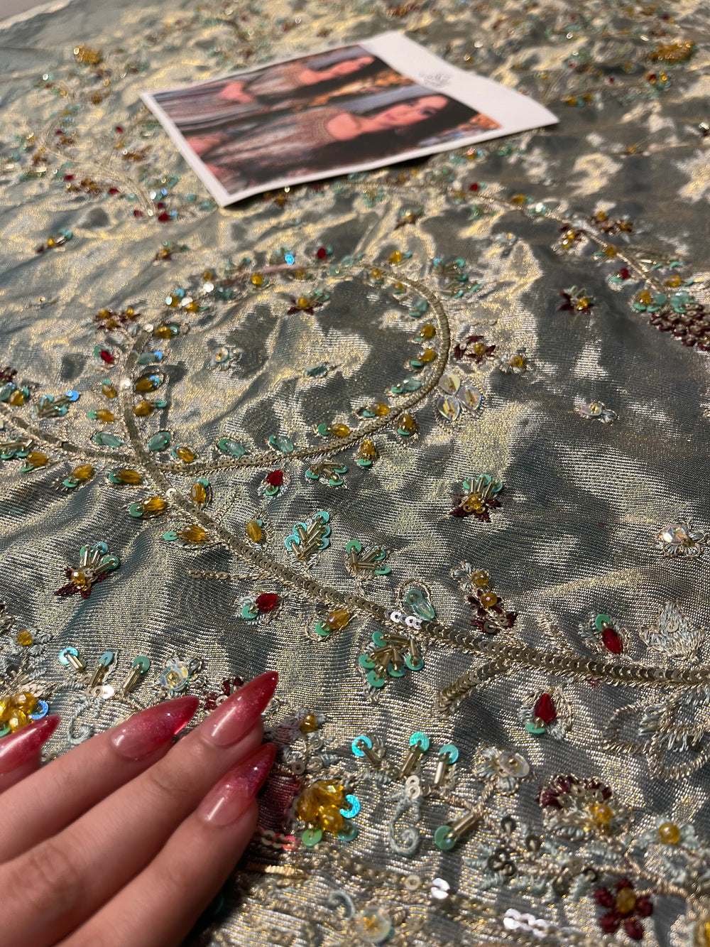 This graceful ensemble is rendered in a soothing aqua-teal palette, elevated with intricate embellishments throughout. The design showcases delicate hand-worked motifs paired with an opulently embellished/embroidered border, creating a look of refined elegance. A flowing dupatta with ornate detailing completes the ensemble, making it a perfect choice for festive occasions and formal celebrations.