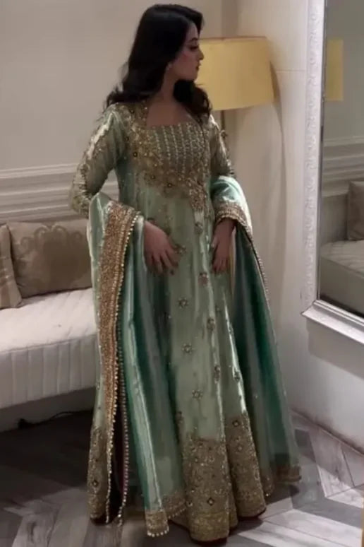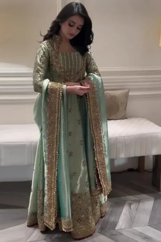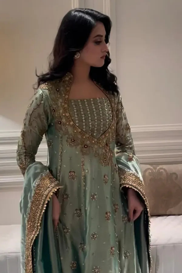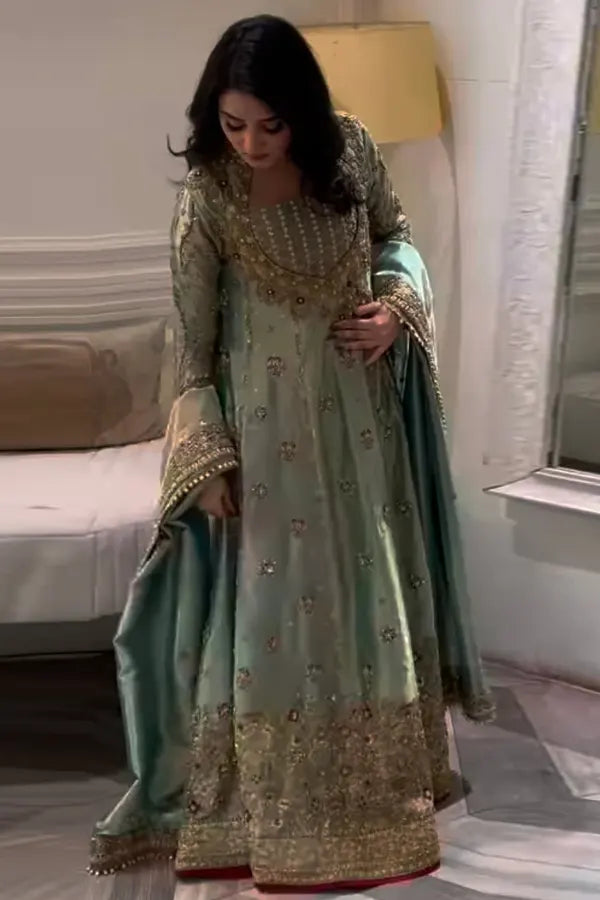 The silhouette is tailored to flatter with ease. Clean lines are softened by fluid contours, creating a form that adapts naturally to the wearer. Whether styled for a formal celebration, an intimate gathering, or an elegant evening affair, Urooj transitions effortlessly, reflecting both the occasion and the individuality of the woman who wears it.