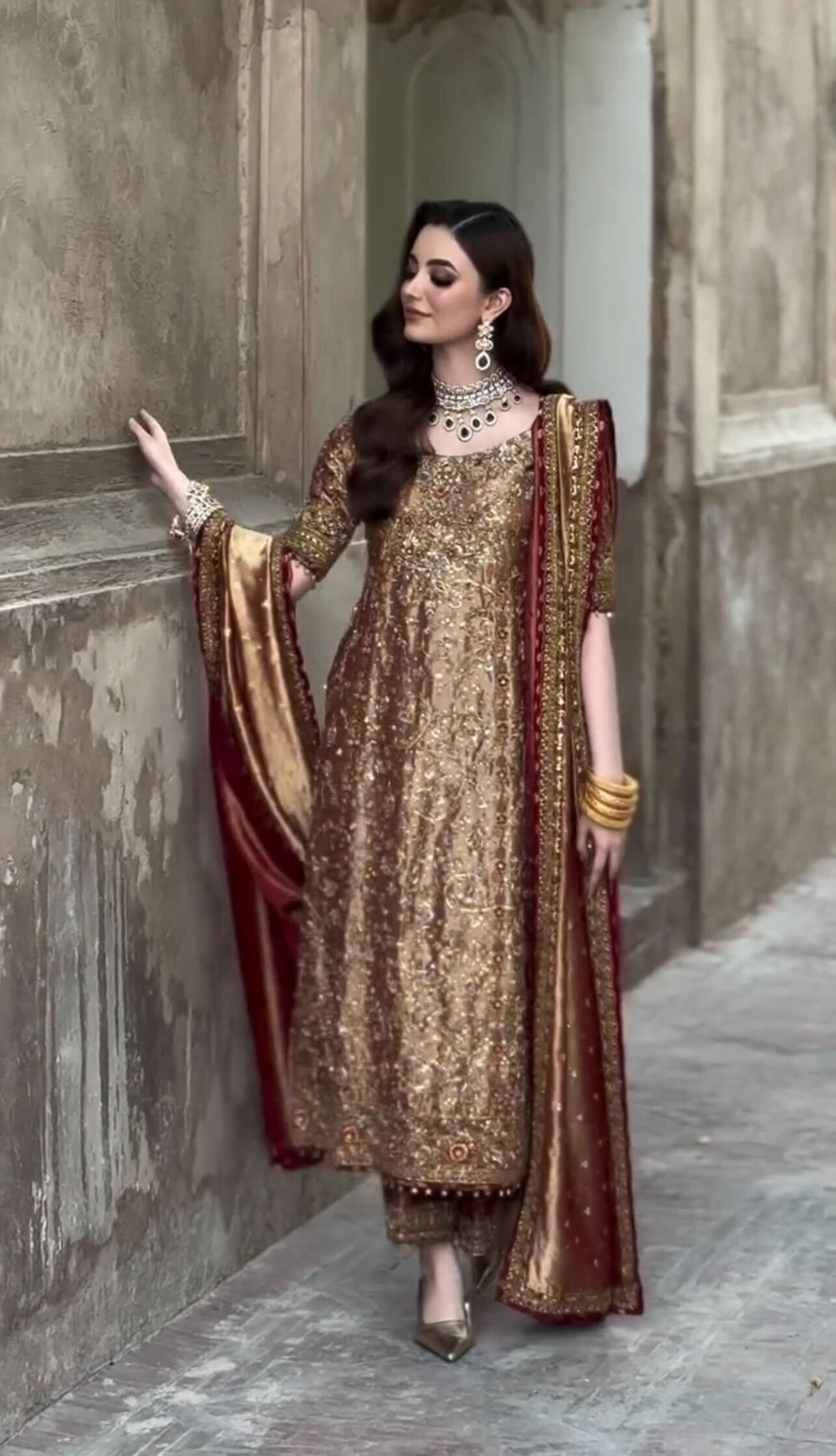 Make a grand statement in this luxurious deep bronze silk ensemble, exuding traditional opulence and timeless elegance. The outfit features delicate gold motifs throughout, complemented by intricate hand-embellished detailing on the hem and neckline. Paired with a rich matching dupatta bordered with embellished accents and subtle maroon piping.